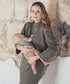 El set más lindo y funcional para embarazo y posparto. Blusa de manga larga con cruce tipo kimono, perfecta para lactancia, y pantalones low rise straight que combinan con todo. Úsalo con tenis para el día a día o con botines para elevar tu look.
