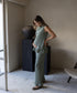Un set divino en una tela acanalada verde con un toque romántico. Confeccionado en una tela acanalada en tonalidades de verde súper en tendencia, con olanes en la bastilla del pantalón y la blusa, que le dan un aire femenino y original. La blusa es sin mangas con cuello alto, y con un pantalón de tiro alto y silueta straight estiliza y acompaña el cuerpo con comodidad. Ideal para cuando quieres verte linda sin perder libertad ni movimiento. Un look que se siente tan especial como se ve.