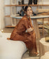 Un set con muchísimo estilo, en una tela acanalada satinada en color bronce, con una blusa larga tipo túnica asimétrica con aberturas en los costados, manga larga y pantalones straight. Incluye un cinturón de tela para usarlo y resaltar tu baby bump o si te gusta un look más suelto también se ve igual de increíble.