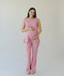 ¡El set más bonito y perfecto para tu baby shower! Confeccionado en un tela rosa súper en tendencia en una textura corrugada. Con una blusa sin mangas de cuello redondo y un pantalón, con su panel de panza en una silueta flare. Su diseño minimalista lo hace perfecto para jugar con accesorios y calzado: combínalo con sandalias, o tacones y crea un look formal-casual. Moderno, versátil y con ese toque elegante que nunca pasa de moda.