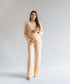 Un look elegante en tono beige. Hecho en mesh texturizado con velvet en animal print al mismo color. La blusa lleva hombreras, cuello semi alto y mangas flare; el pantalón straight con panel de panza suave te dará soporte y estilo a la vez. Ideal para día o noche.