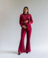 Un set único en color tinto espectacular. Confeccionado en mesh texturizado con velvet en animal print al tono. La blusa tiene hombreras, cuello ligeramente alto y mangas flare; el pantalón flare incluye panel de panza en tela deliciosa. Sofisticado, cómodo y perfecto para una ocasión especial.