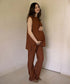 ¡El set más bonito y atemporal para este otoño! Confeccionado en un tela café súper en tendencia en una textura corrugada. Con una blusa sin mangas de cuello redondo y un pantalón, con su panel de panza en una silueta flare. Su diseño minimalista lo hace perfecto para jugar con accesorios y calzado: combínalo con botas, mules o tenis y crea un look formal-casual que funciona de día o de noche. Moderno, versátil y con ese toque elegante que nunca pasa de moda.